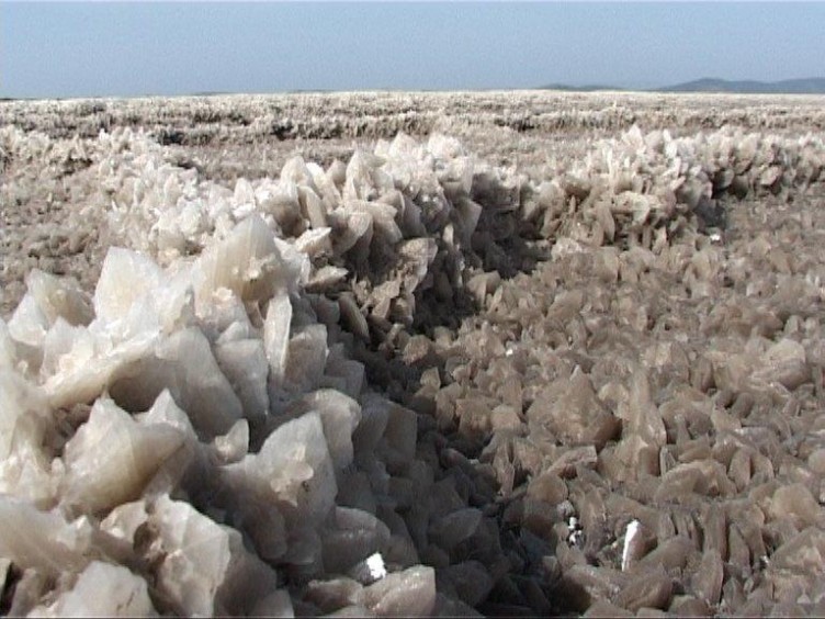 Για ένα χρονικό διάστημα αποσύρονται τα νερά και σε ορισμένα αλοπήγεια αποκαλύπτεται μία έκταση με κρυστάλλινους σχηματισμούς. Στην ουσία είναι ένας μικρόκοσμος από άλατα του ασβεστίου που επικάθονται σε κάποια στάδια της εξάτμισης του νερού για την παραγωγή του αλατιού.